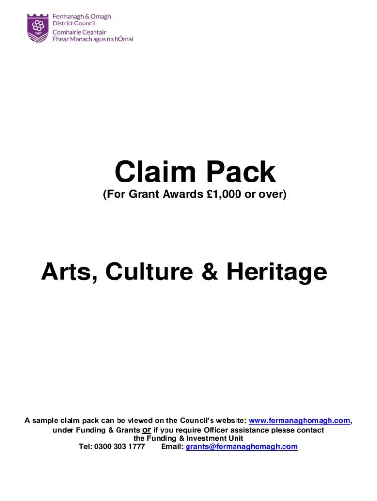 Claim Pack (For Grant Awards 1,000 or over)Arts, Culture & Heritage sample claim pack can be viewed on the Councils website: www.fermanaghomagh.com, under Funding & Grants or if you require Officer