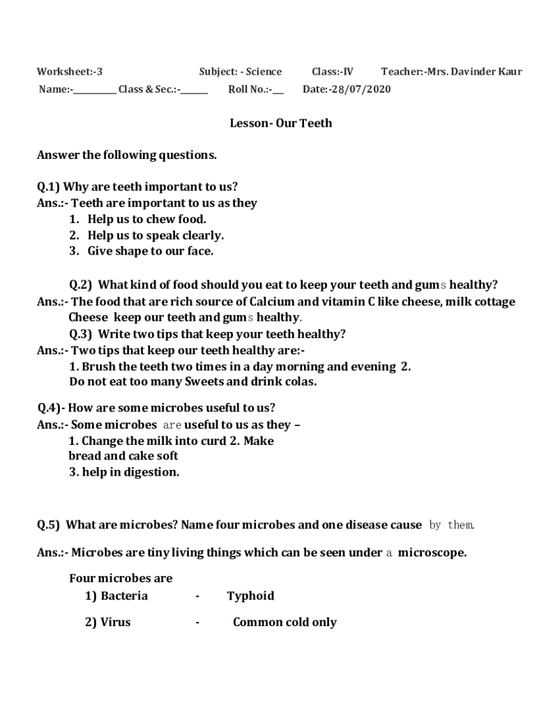 Worksheet:3Subject: ScienceName:___ Class & Sec.:___Roll No.:___Class:Teacher:Mrs. Ravinder Karate:28/07/2020Lesson Our Teeth Answer the following questions. Q.1) Why are teeth important to us? Ans.:
