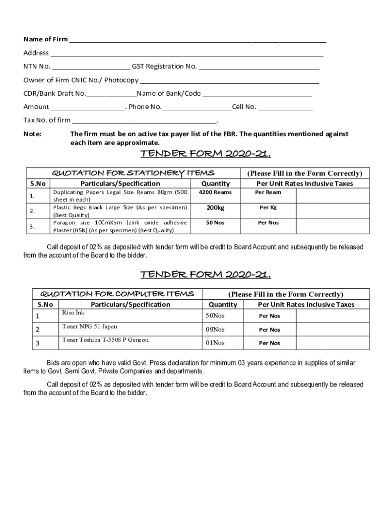 Name of Firm ___ Address ___ NON No. ___ GST Registration No. ___ Owner of Firm CNIC No./ Photocopy ___ CDR/Bank Draft No.___Name of Bank/Code ___ Amount ___. Phone No.___Cell No. ___ Tax No. of firm