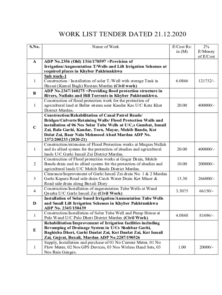 WORK LIST TENDER DATED 21.12.2020 S. No. Name of Worked No.2356 (Old) 1316/170597 Provision of Irrigation/Augmentation T/Wells and Lift Irrigation Schemes at required places in Khyber Pakhtunkhwa