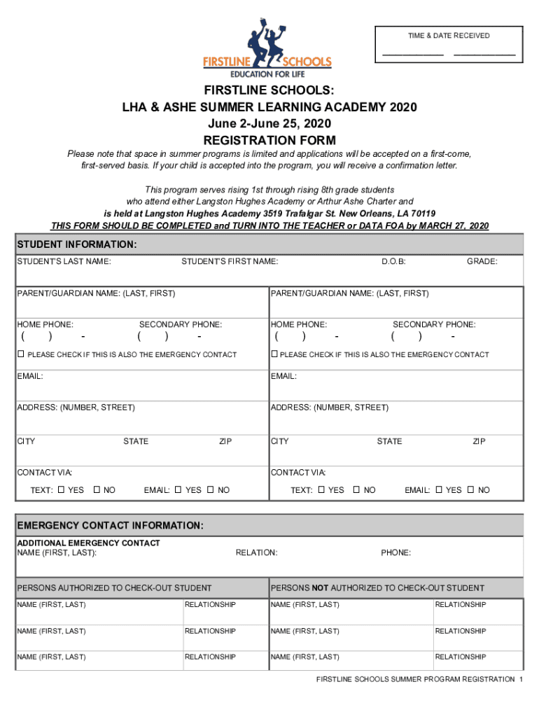 TIME & DATE RECEIVED___ ___ AIRLINE SCHOOLS: LA & ASHE SUMMER LEARNING ACADEMY 2020 June 2June 25, 2020 REGISTRATION FORM Please note that space in summer programs is limited and applications will