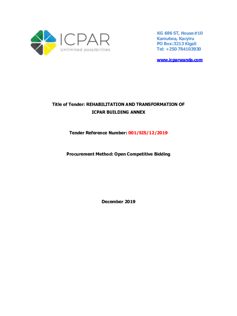 KG 686 ST, House #10 Fatwa, ACSFRU PO Box:3213 Kigali Tel: +250 784103930 www.icparwanda.comTitle of Tender: REHABILITATION AND TRANSFORMATION OF ICP AR BUILDING Extender Reference Number: 001/SIS/12/2019Procurement