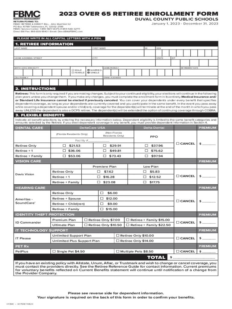 2023 OVER 65 RETIREE ENROLLMENT FORMAL COUNTY PUBLIC SCHOOLSRETURN FORMS TO: BMC RETIREE & DIRECT BILL Attn: Mail Slot 32 PO Box 10789 Tallahassee, FL 323022789 BMC Service Center: 18555MYDCPS (18555693277)