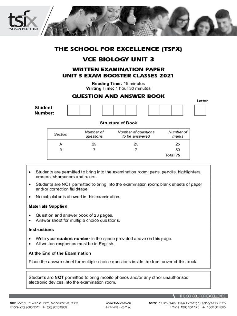 THE SCHOOL FOR EXCELLENCE (SFX) ICE BIOLOGY UNIT 3 WRITTEN EXAMINATION PAPER UNIT 3 EXAM BOOSTER CLASSES 2021 Reading Time: 15 minutes Writing Time: 1 hour 30 minutesQUESTION AND ANSWER BOOKLetterStudent