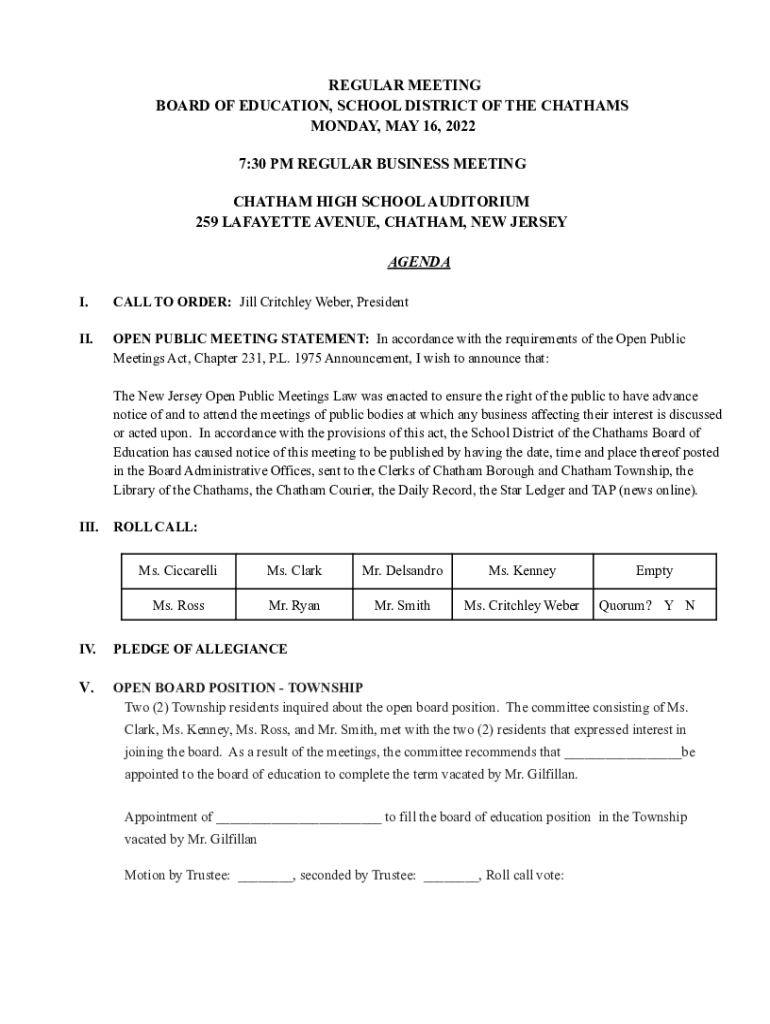 REGULAR MEETING BOARD OF EDUCATION, SCHOOL DISTRICT OF THE CHATHAM MONDAY, MAY 16, 2022 7:30 PM REGULAR BUSINESS MEETING CHATHAM HIGH SCHOOL AUDITORIUM 259 LAFAYETTE AVENUE, CHATHAM, NEW JERSEY AGENDA