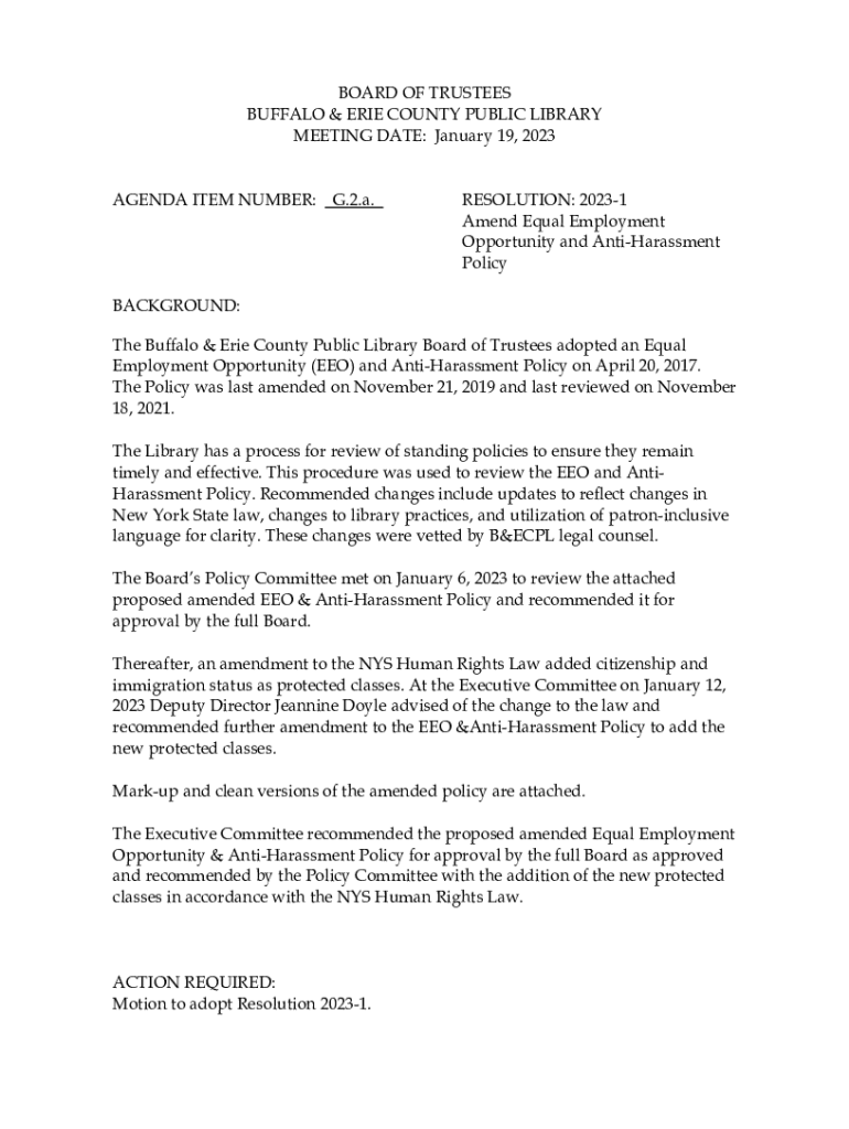 BOARD OF TRUSTEES BUFFALO & ERIE COUNTY PUBLIC LIBRARY MEETING DATE: January 19, 2023, AGENDA ITEM NUMBER: G.2.a.RESOLUTION: 20231 Amend Equal Employment Opportunity and AntiHarassment PolicyBACKGROUND: