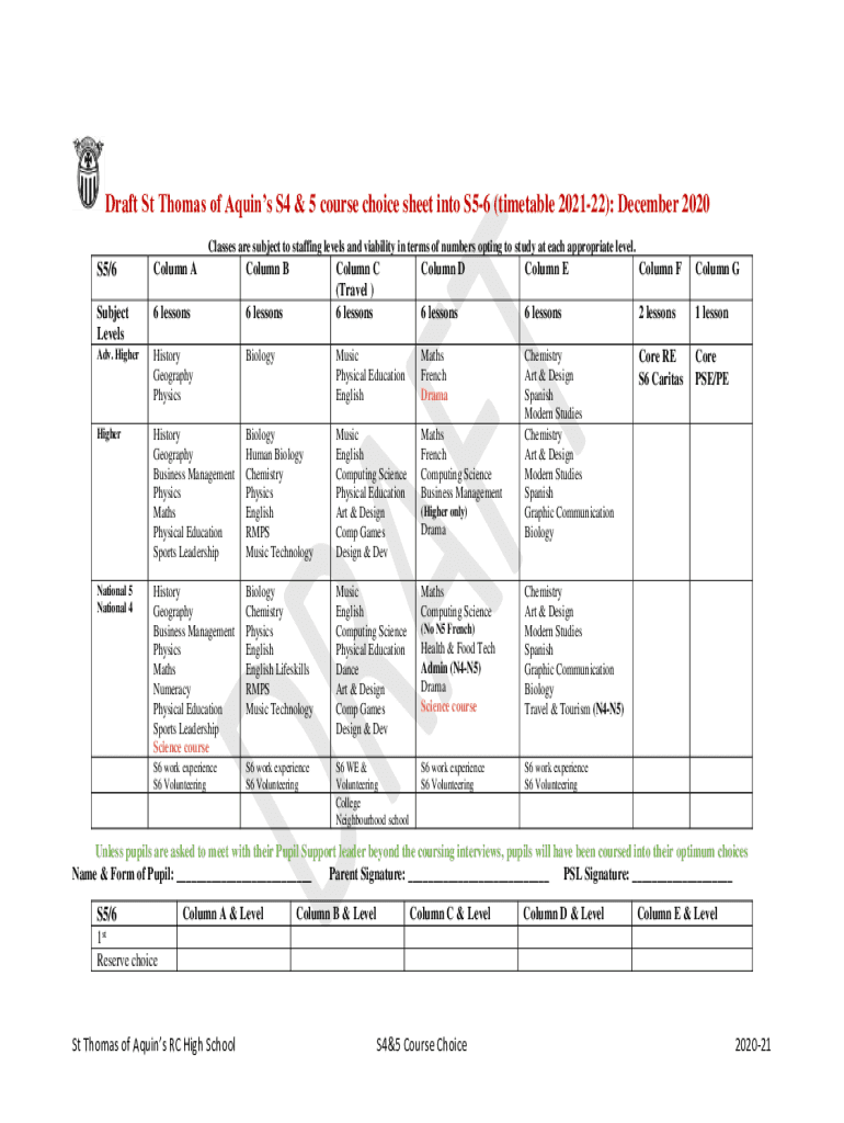 Get the free Draft St Thomas of Aquin's S4 & 5 course choice sheet into S5 ...