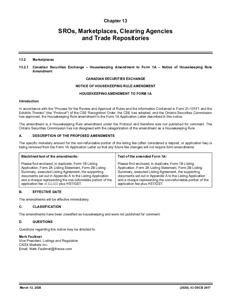 Get the free Notice of Housekeeping Rule Amendment - Housekeeping Amendment to Form 1A - Canadian...