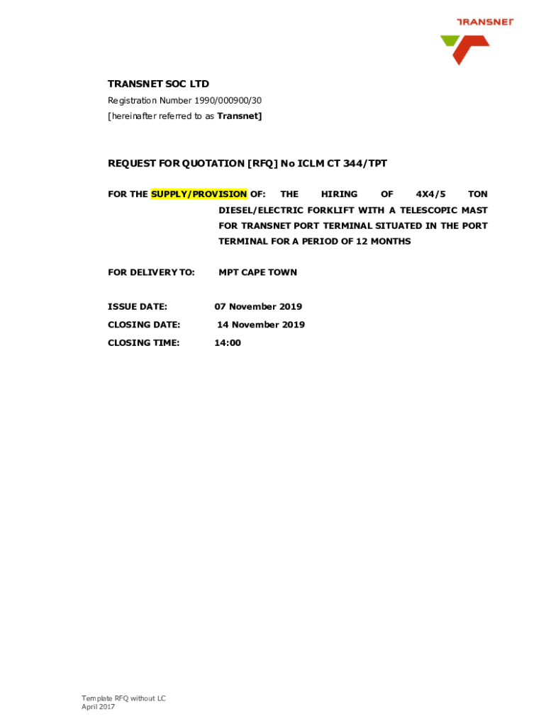 TRANSFER SOC LTD Registration Number 1990/000900/30 [hereinafter referred to as Transnet]REQUEST FOR QUOTATION [RFQ] No ICL MCT 344/TPT FOR THE SUPPLY/PROVISION OF:THEHIRINGOF4X4/5TONDIESEL/ELECTRIC