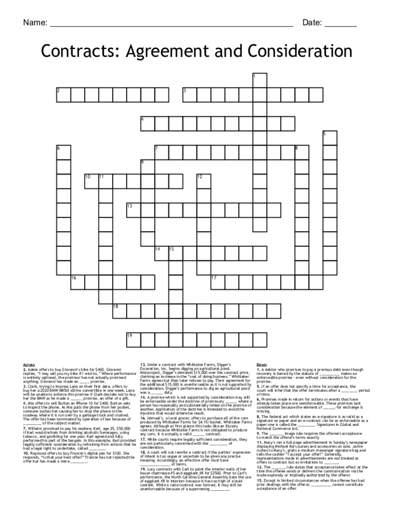 Name: ___ Date: ___Contracts: Agreement and Consideration 1 234 5 6789 10111213141615171819Across 2. Adele offers to buy Giovanni's bike for $400. Giovanni replies, I may sell you my bike if I wish