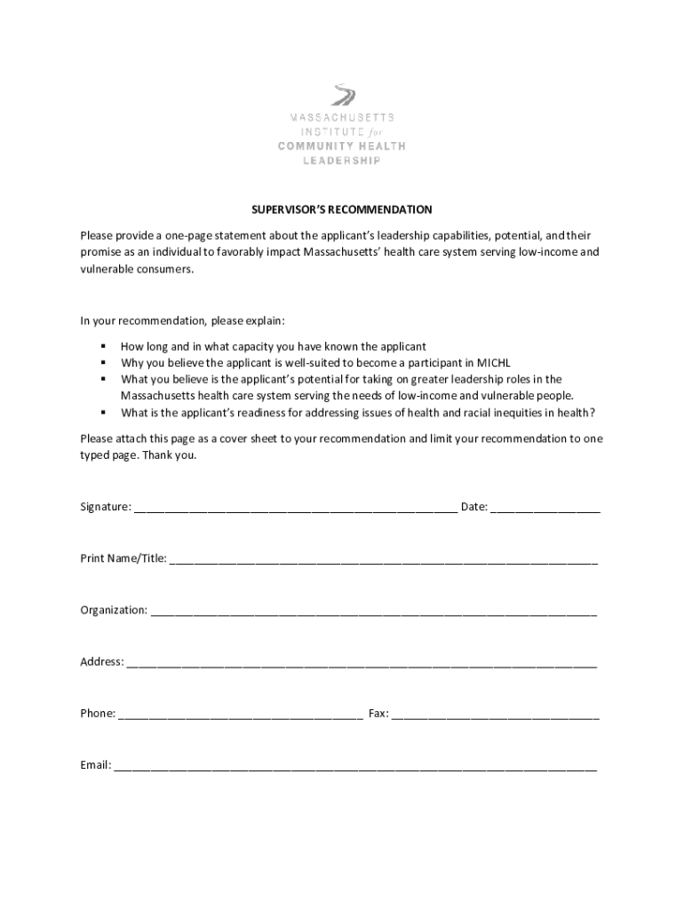 SUPERVISORS RECOMMENDATION Please provide a one-page statement about the applicants' leadership capabilities, potential, and their promise as an individual to favorably impact Massachusetts health