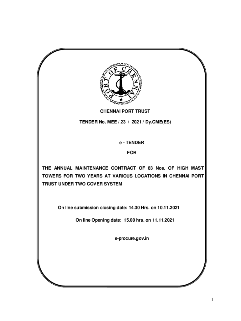 CHENNAI PORT TRUST TENDER No. ME / 23 / 2021 / Dy.CME(ES)e TENDER FOR THE ANNUAL MAINTENANCE CONTRACT OF 83 Nos. OF HIGH MAST TOWERS FOR TWO YEARS AT VARIOUS LOCATIONS IN CHENNAI PORT TRUST UNDER