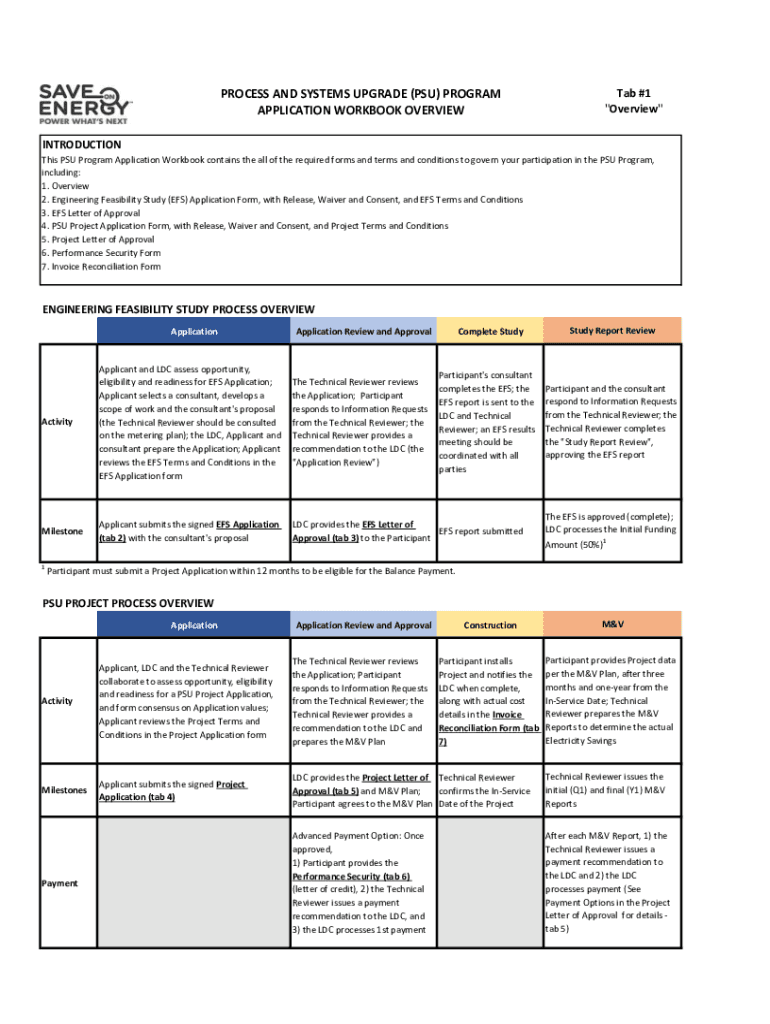 PROCESS AND SYSTEMS UPGRADE (PSU) PROGRAM APPLICATION WORKBOOK Overview #1 \” Overview\” INTRODUCTION This PSU Program Application Workbook contains the all the required forms and terms and conditions