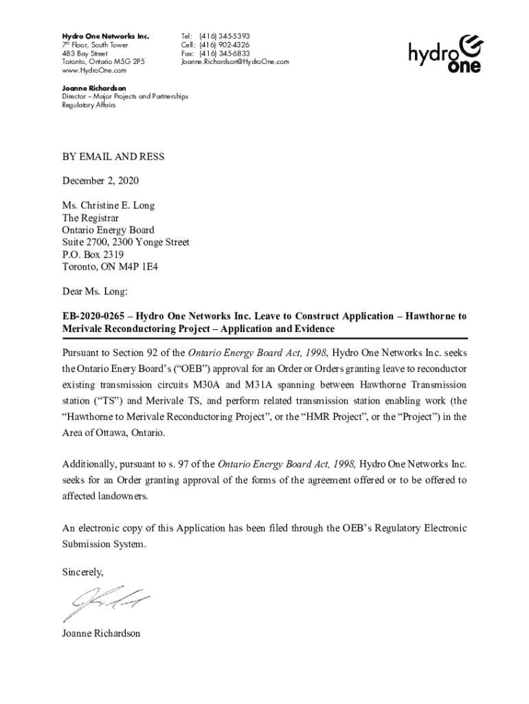 Hydro One Networks Inc.7th Floor, South Tower 483 Bay Street Toronto, Ontario M5G 2P5 www.HydroOne.comTel: (416) 3455393 Cell: (416) 9024326 Fax: (416) 3456833 Joanne.Richardson@HydroOne.comJoanne