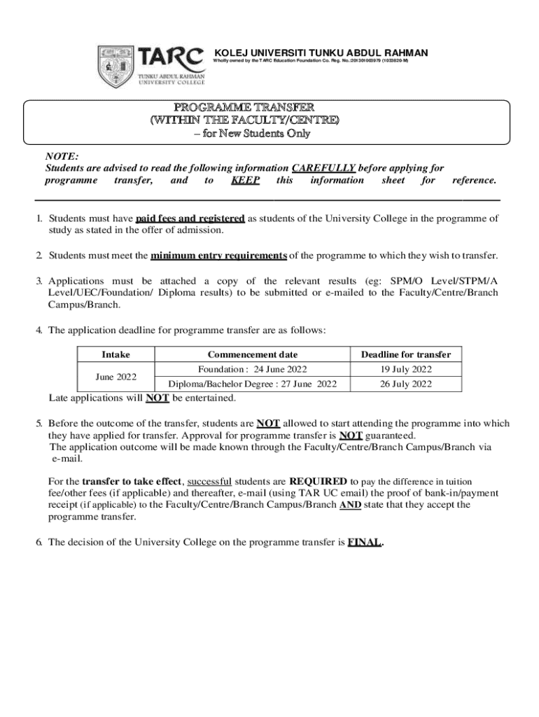 KO LEJ UNIVERSITY TUN KU ABDUL RAHMAN Wholly owned by the ARC Education Foundation Co. Reg. No.:201301003979 (1033820M)Program TRANSFER (WITHIN THE FACULTY/Center) for New Students Only NOTE: Students