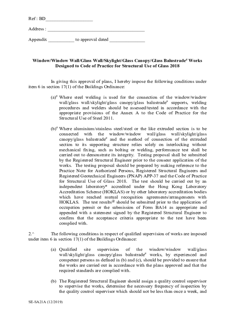 Ref : BD___ Address : ___ Appendix ___ to approval dated ___Window/Window Wall/Glass Wall/Skylight/Glass Canopy/Glass Balustrade# Works Designed to Code of Practice for Structural Use of Glass 2018