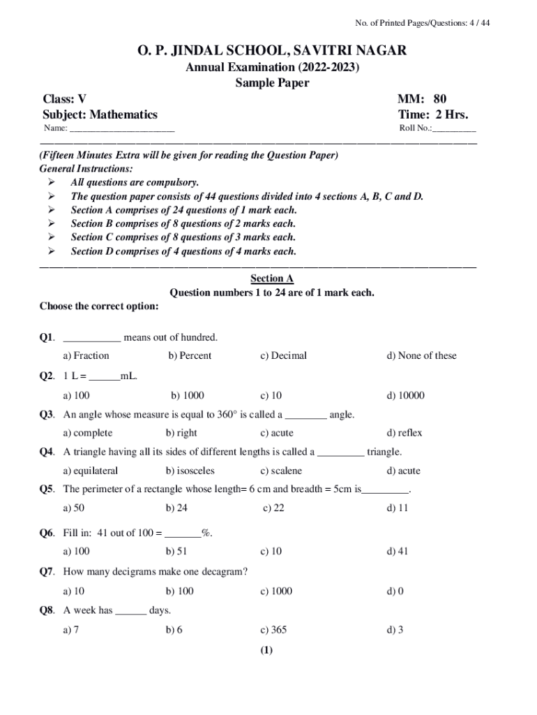 No. Of Printed Pages/Questions: 4 / 44O. P. FINAL SCHOOL, SAVITṚ NAGAR Annual Examination (20222023) Sample Paper Class: V Subject: Mathematics MM: 80 Time: 2 Hrs. Name: ___Roll No.:______(Fifteen