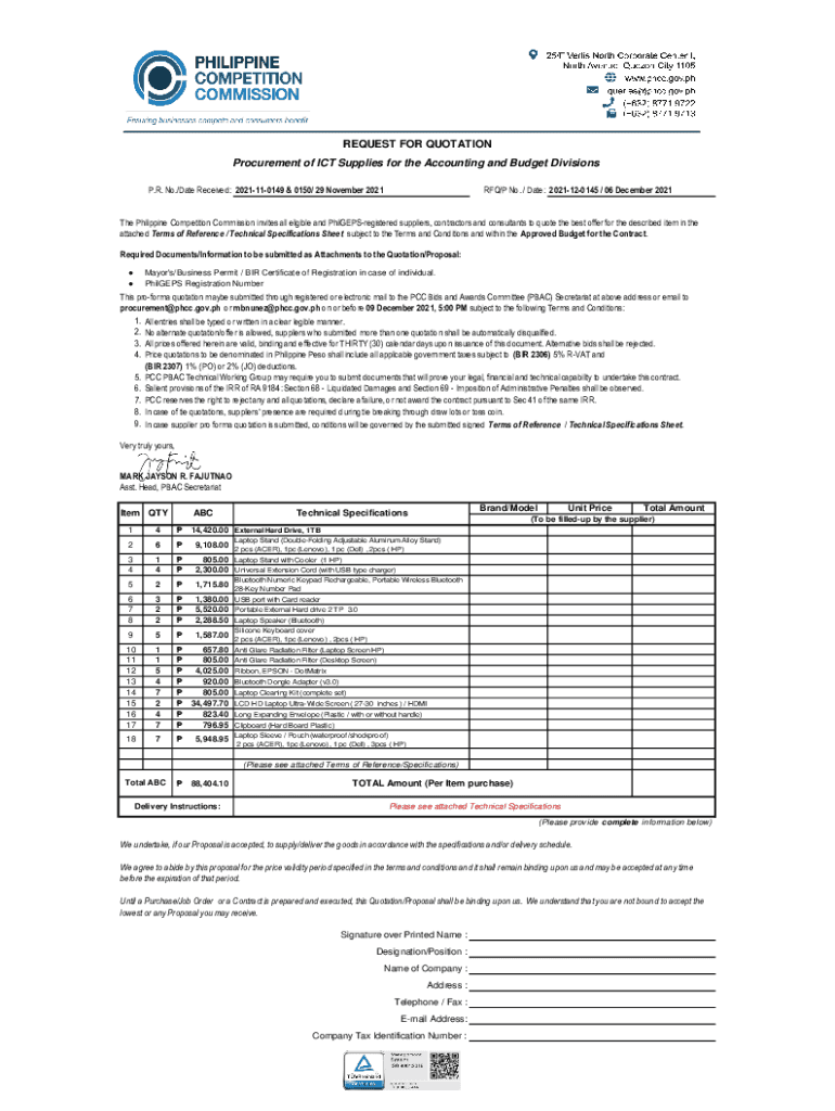 REQUEST FOR QUOTATION Procurement of ICT Supplies for the Accounting and Budget Divisions P.R. No./Date Received: 2021110149 & 0150/ 29 November 2021RFQ/P No. / Date: 2021120145 / 06 December 2021The