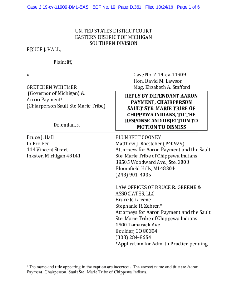 Case 2:19cv11909DMLEAS ECF No. 19, Paged.361 Filed 10/24/19-Page 1 of 6BRUCE J. HALL, UNITED STATES DISTRICT COURT EASTERN DISTRICT OF MICHIGAN SOUTHERN DIVISIONPlaintiff, v. GRETCHEN WHITMER (Governor