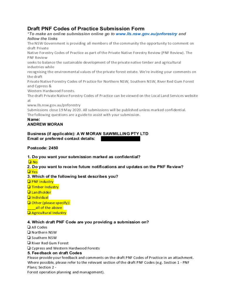 Draft PNF Codes of Practice Submission Form *To make an online submission online go to www.lls.nsw.gov.au/pnforestry and follow the links The NSW Government is providing all members of the community