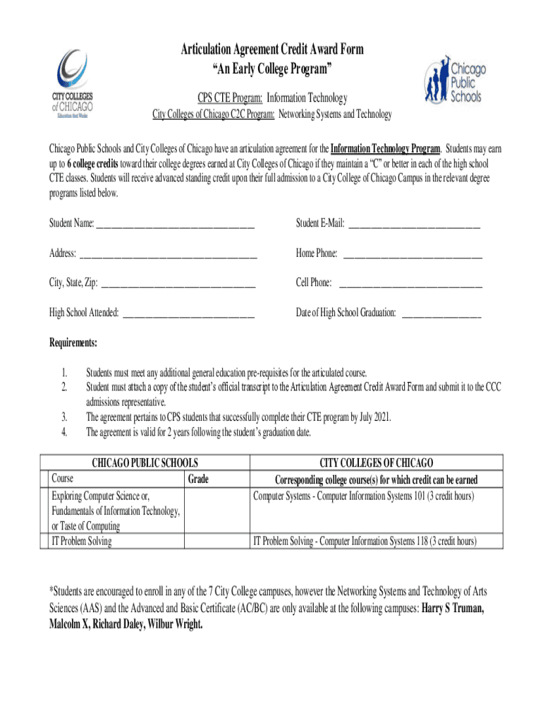 Articulation Agreement Credit Award Form An Early College Program CPS CTE Program: Information Technology City Colleges of Chicago C2C Program: Networking Systems and Technology Chicago Public Schools