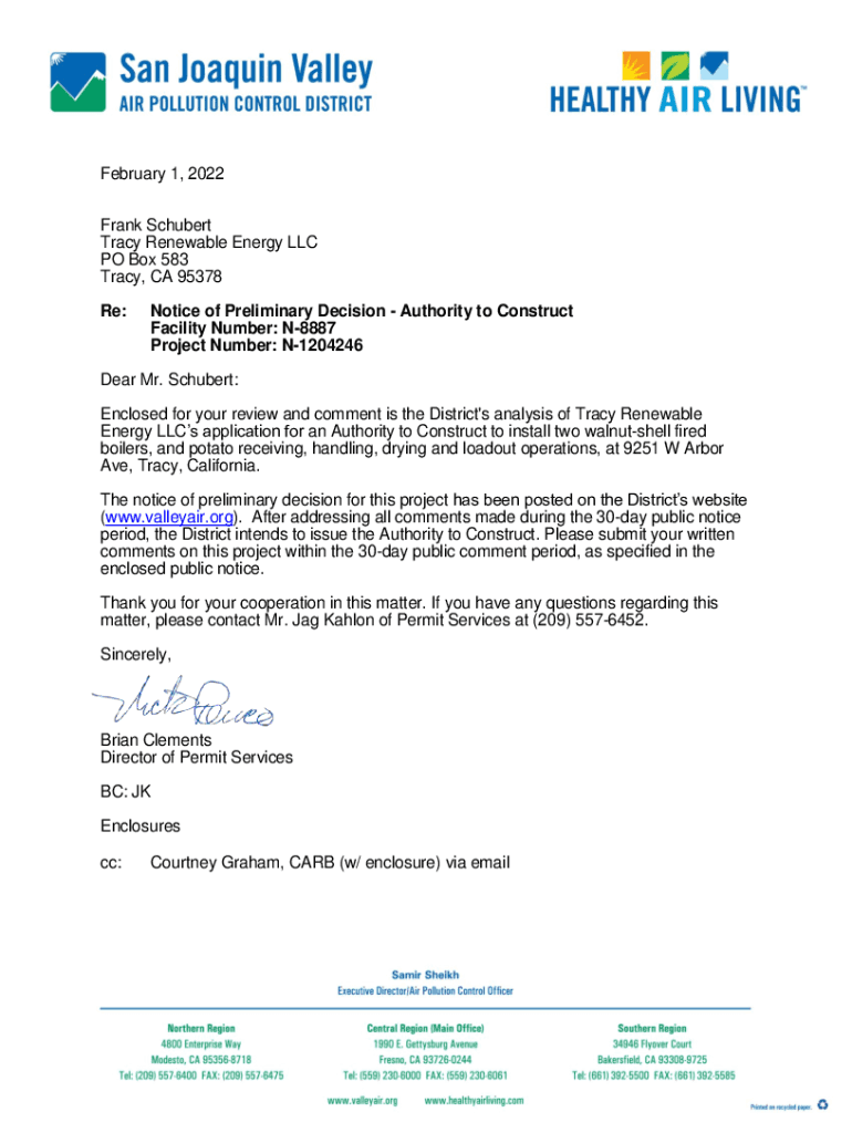 February 1, 2022, Frank Schubert Tracy Renewable Energy LLC PO Box 583 Tracy, CA 95378 Re:Notice of Preliminary Decision Authority to Construct Facility Number: N8887 Project Number: N1204246Dear