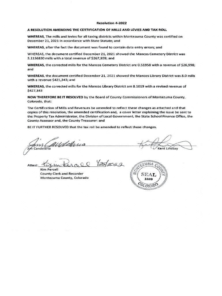 Resolution 42022 A RESOLUTION AMENDING THE CERTIFICATION OF MILLS AND LEVIES AND TAX ROLL WHEREAS, The mills and levies for all taxing districts within Montezuma County was certified on December 21,
