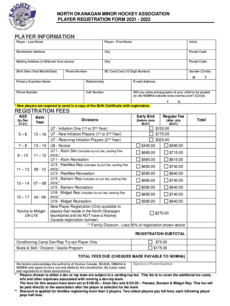 NORTH FLANAGAN MINOR HOCKEY ASSOCIATION PLAYER REGISTRATION FORM 2021 2022PLAYER INFORMATION Player Last Nameplate First NameInitialResidential AddressCityPostal Compiling Address (if different from