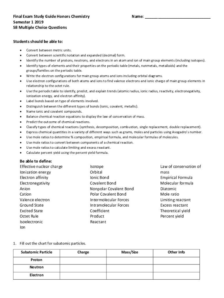 Final Exam Study Guide Honors Chemistry Semester 1 2019 58 Multiple Choice Questionnaire: ___Students should be able to: Convert between metric units. Convert between scientific notation and expanded
