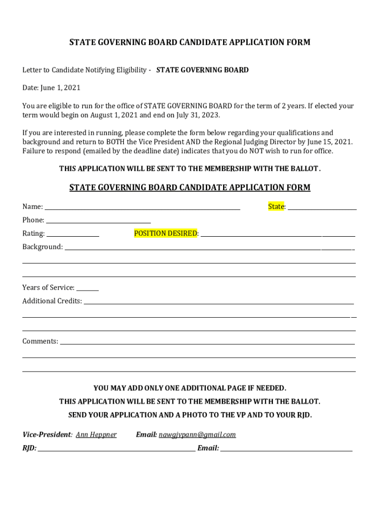STATE GOVERNING BOARD CANDIDATE APPLICATION FORM Letter to Candidate Notifying Eligibility STATE GOVERNING BOARD Date: June 1, 2021, You are eligible to run for the office of STATE GOVERNING BOARD