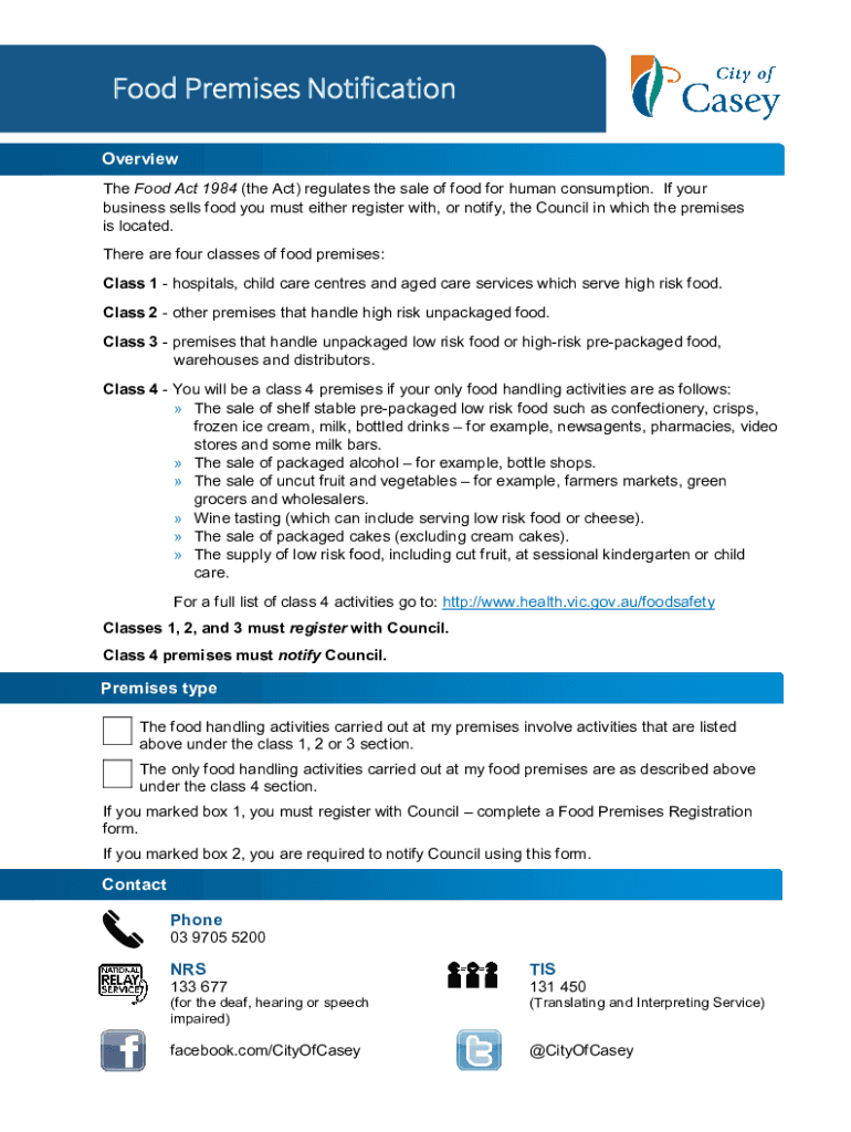 Food Premises Notification Overview The Food Act 1984 (the Act) regulates the sale of food for human consumption. If your business sells food you must either register with, or notify, the Council