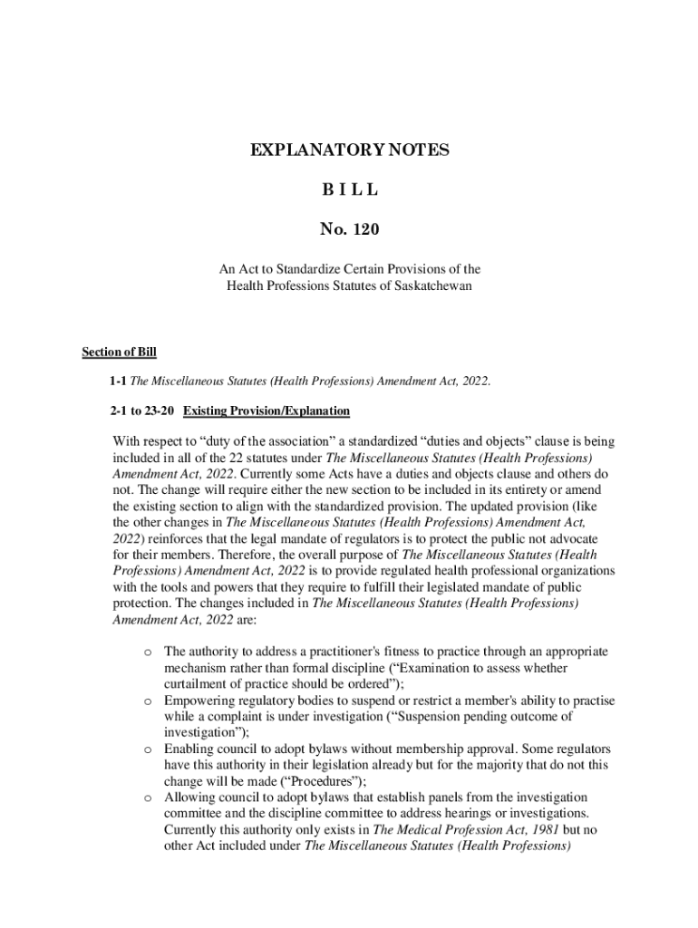 EXPLANATORY NOTES BILL No. 120 An Act to Standardize Certain Provisions of the Health Professions Statutes of SaskatchewanSection of Bill 11 The Miscellaneous Statutes (Health Professions) Amendment
