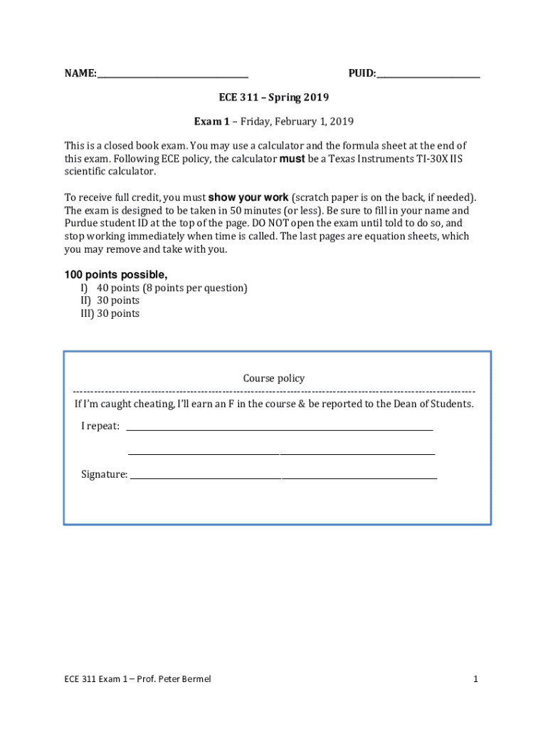 NAME:___PAID:___ECE 311 Spring 2019 Exam 1 Friday, February 1, 2019, This is a closed book exam. You may use a calculator and the formula sheet at the end of this exam. Following ECE policy, the calculator