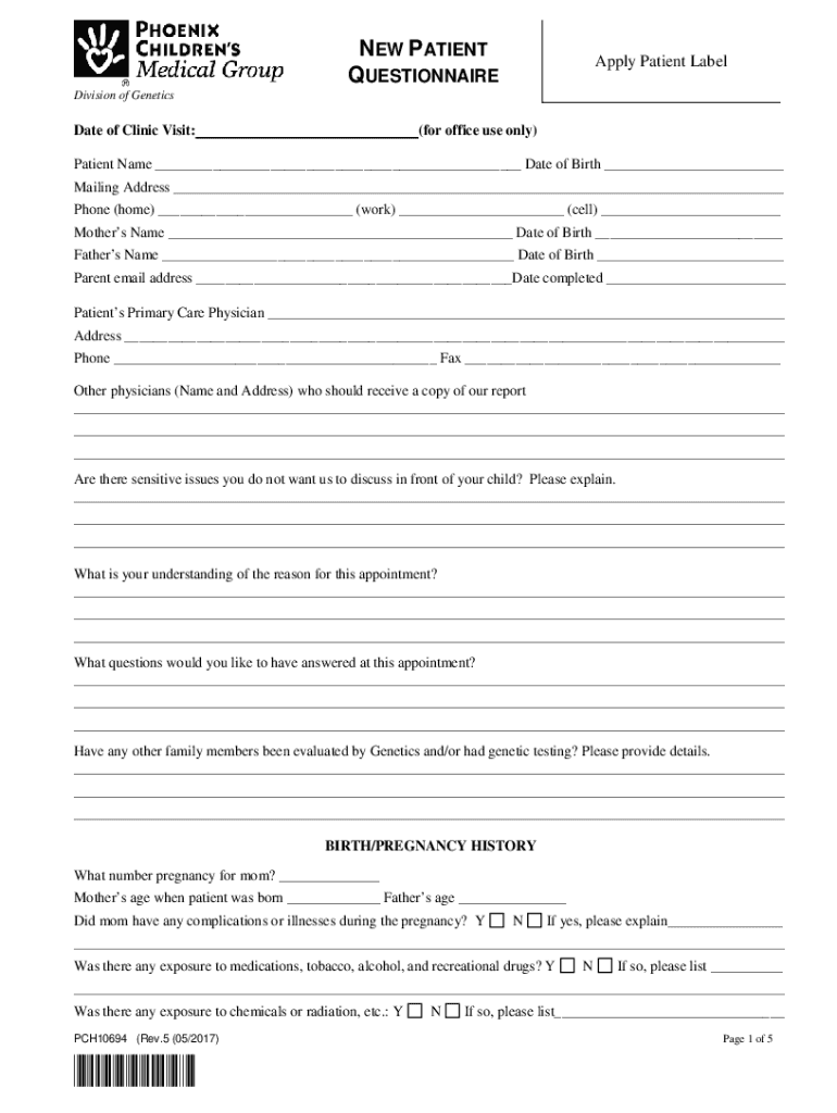 NEW PATIENT QUESTIONNAIREApply Patient LabelDivision of GeneticsDate of Clinic Visit:(for office use only)Patient Name ___ Date of Birth ___ Mailing Address ___ Phone (home) ___ (work) ___ (cell)