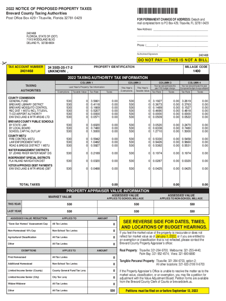 *2401468×2022 NOTICE OF PROPOSED PROPERTY TAXES Brevard County Taxing Authorities Post Office Box 429 Titusville, Florida 327810429FOR PERMANENT CHANGE OF ADDRESS: Detach and mail completed form