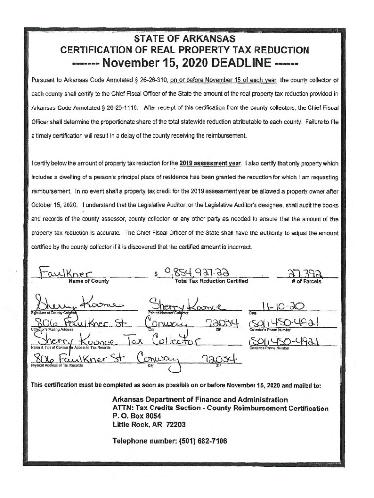 STATE OF ARKANSAS CERTIFICATION OF REAL PROPERTY TAX REDUCTION November 15, 2020, DEADLINE Pursuant to Arkansas Code Annotated 2626310, on or before November 15 of each year, the county collector