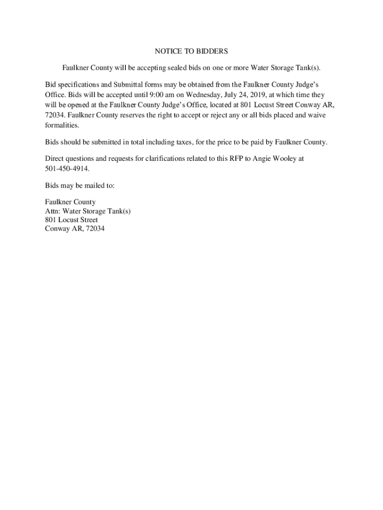 NOTICE TO BIDDERS Faulkner County will be accepting sealed bids on one or more Water Storage Tank(s). Bid specifications and Submittal forms may be obtained from the Faulkner County Judges Office.