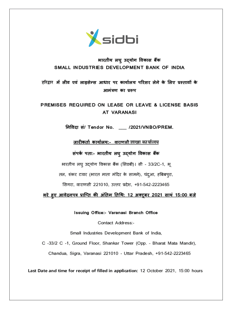 SMALL INDUSTRIES DEVELOPMENT BANK OF INDIA PREMISES REQUIRED ON LEASE OR LEAVE & LICENSE BASIS AT VARANASI / Tender No.___ /2021/VN BO/POEM