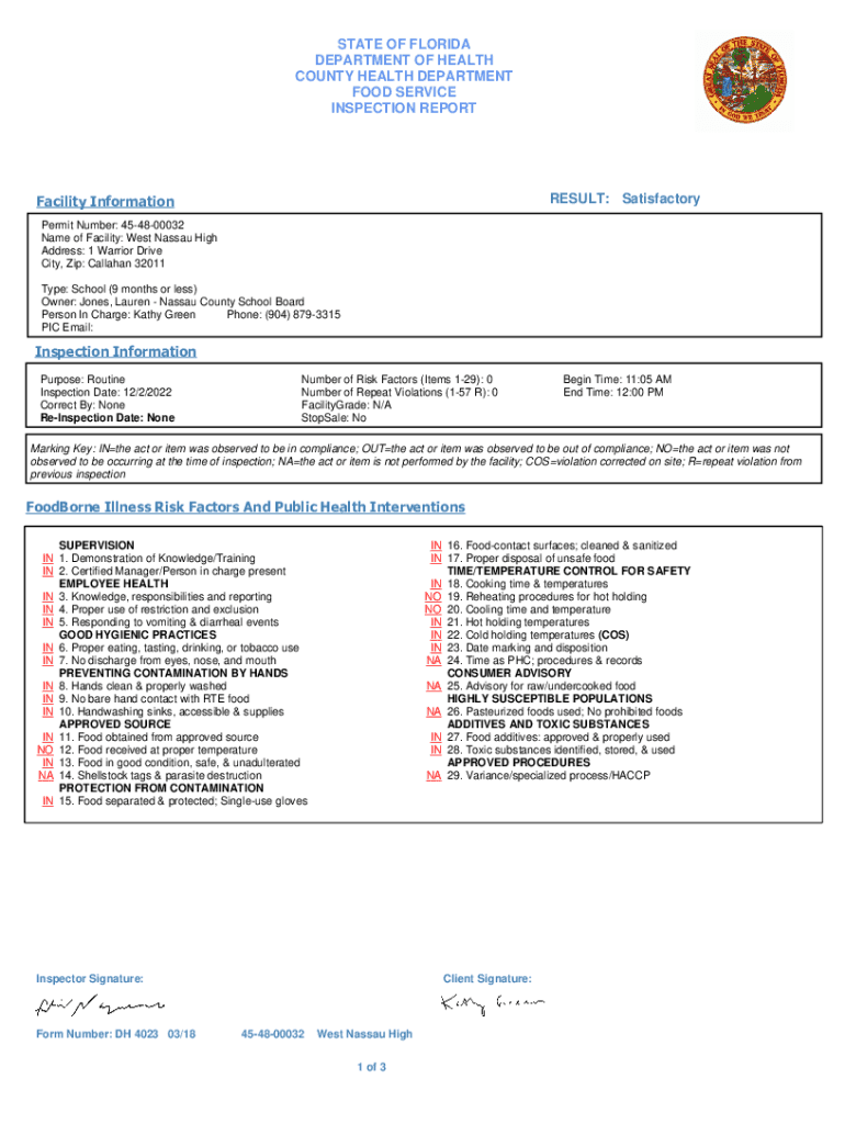 STATE OF FLORIDA DEPARTMENT OF HEALTH COUNTY HEALTH DEPARTMENT FOOD SERVICE INSPECTION REPORTRESULT: SatisfactoryFacility Information Permit Number: 454800032 Name of Facility: West Nassau High Address:
