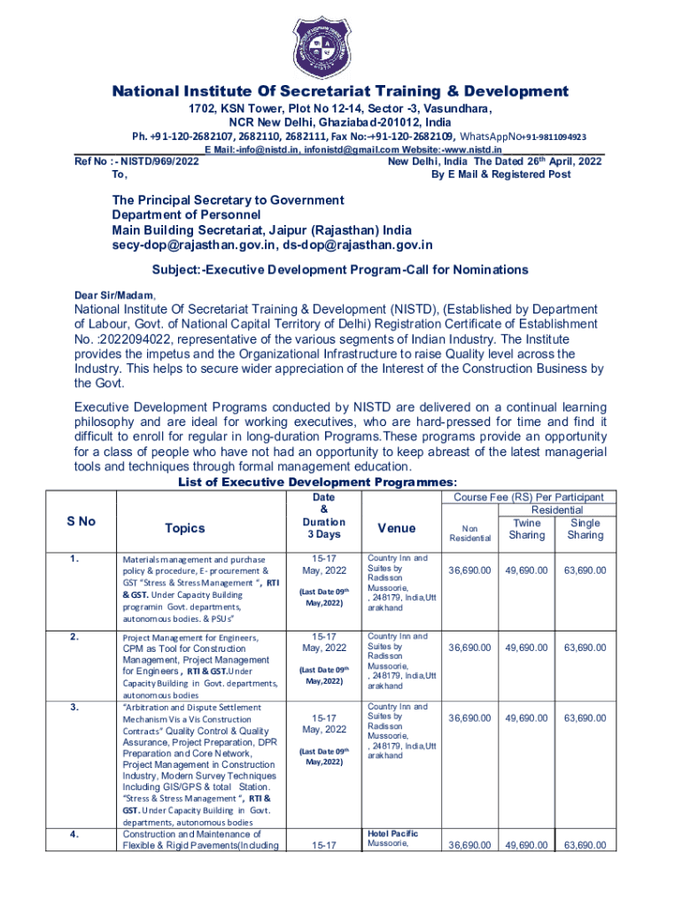 Get the free National Institute of Secretariat Training & Development ... - dop rajasthan...