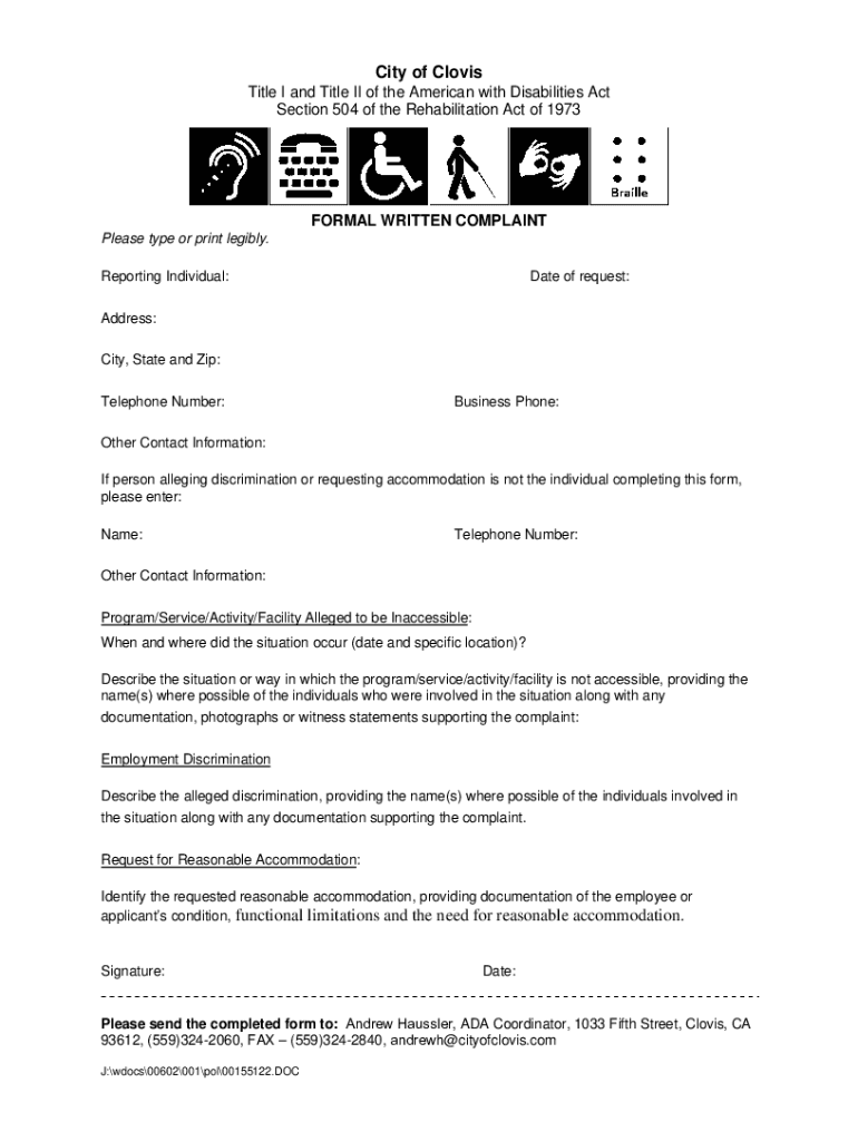 City of Clovis Title I and Title II of the American with Disabilities Act Section 504 of the Rehabilitation Act of 1973FORMAL WRITTEN COMPLAINT Please type or print legibly. Reporting Individual:Date