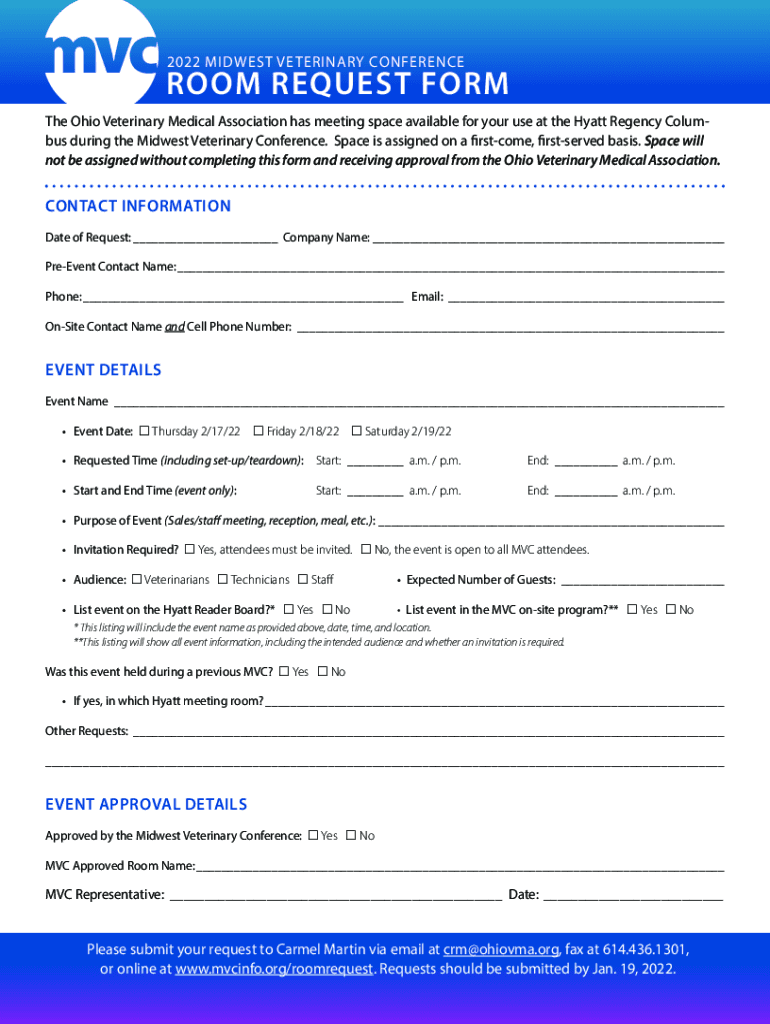 2022 MIDWEST VETERINARY CONFERENCEROOM REQUEST From The Ohio Veterinary Medical Association has meeting space available for your use at the Hyatt Regency Columbus during the Midwest Veterinary Conference.