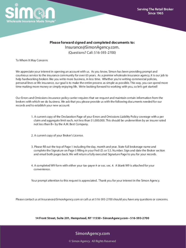 Serving The Retail Broker Since 1965Wholesale Insurance Made SimplePlease forward signed and completed documents to:Insurance@SimonAgency.com. (Questions? Call: 5165932700)To Whom It May Concern: