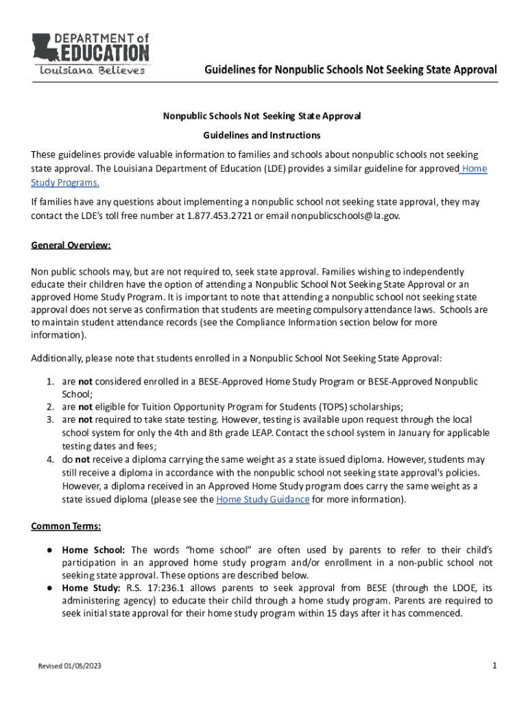 Nonpublic Schools Not Seeking State Approval Guidelines and Instructions These guidelines provide valuable information to families and schools about nonpublic schools not seeking state approval. The