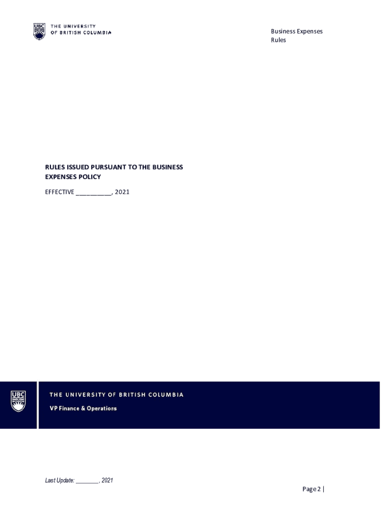 Business Expenses RulesRULES ISSUED PURSUANT TO THE BUSINESS EXPENSES POLICY EFFECTIVE ___, 2021Last Update: ___, 2021Page 2 |Business Expenses Rules TO:UBC Community FR:Peter Smiles, VicePresident