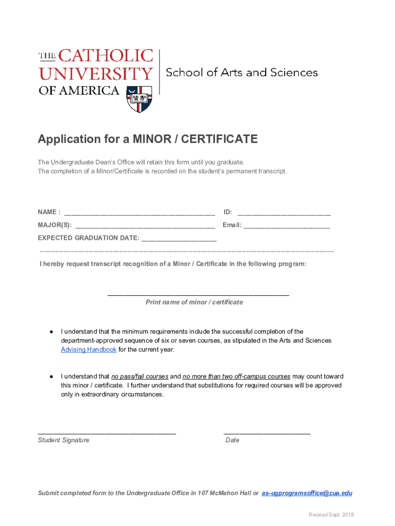 Application for a MINOR / CERTIFICATE The Undergraduate Deans Office will retain this form until you graduate. The completion of a Minor/Certificate is recorded on the students permanent transcript.NAME