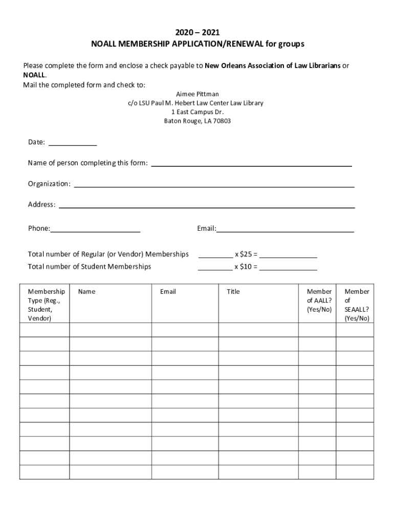 2020 2021 NO ALL MEMBERSHIP APPLICATION/RENEWAL for groups Please complete the form and enclose a check payable to New Orleans Association of Law Librarians or NO ALL. Mail the completed form and