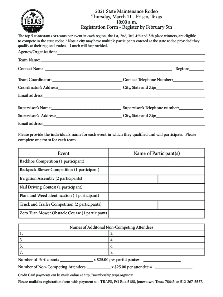 2021 State Maintenance Rodeo Thursday, March 11 Frisco, Texas 10:00 a.m. Registration Form Register by February 5th The top 5 contestants or teams per event in each region, the 1st, 2nd, 3rd, 4th