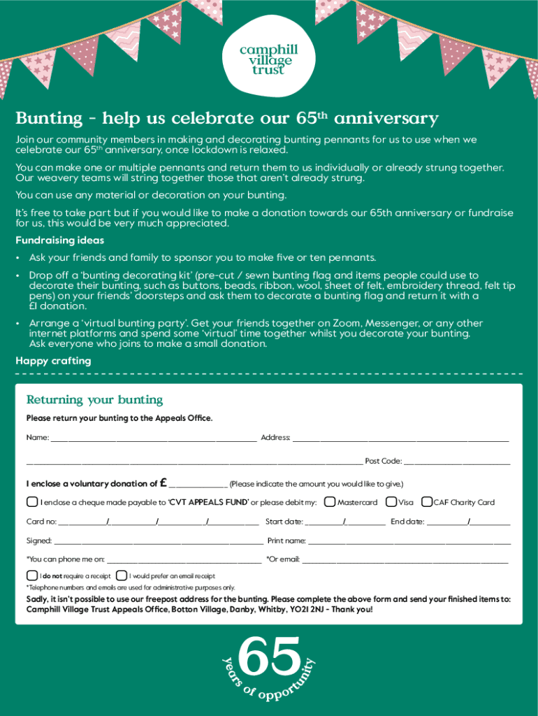 Bunting help us celebrate our 65th anniversary Join our community members in making and decorating bunting pennants for us to use when we celebrate our 65th anniversary, once lockdown is relaxed.