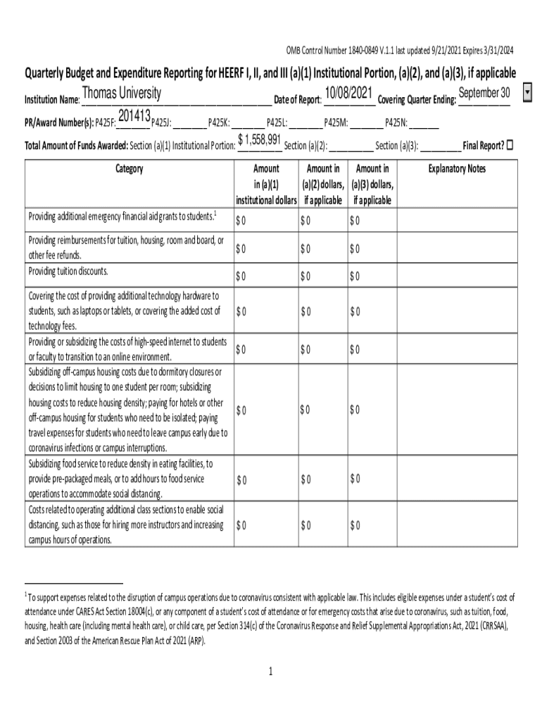 OMB Control Number 18400849 V.1.1 last updated 9/21/2021 Expires 3/31/2024QuarterlyBudgetandExpenditureReportingforHEERFI,II, Andrei(a)(1)Institutionalization, (a)(2), and(a)(3), inapplicable September